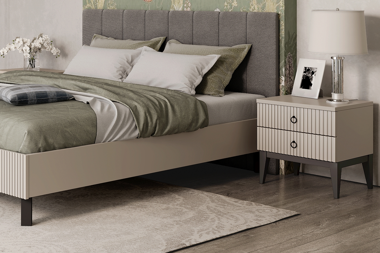 - Мягкое изголовье кровати выполнено в строгом геометрическом стиле и обито тканью приятного серого оттенка, гармонично сочетающегося с общим цветовым решением коллекции.